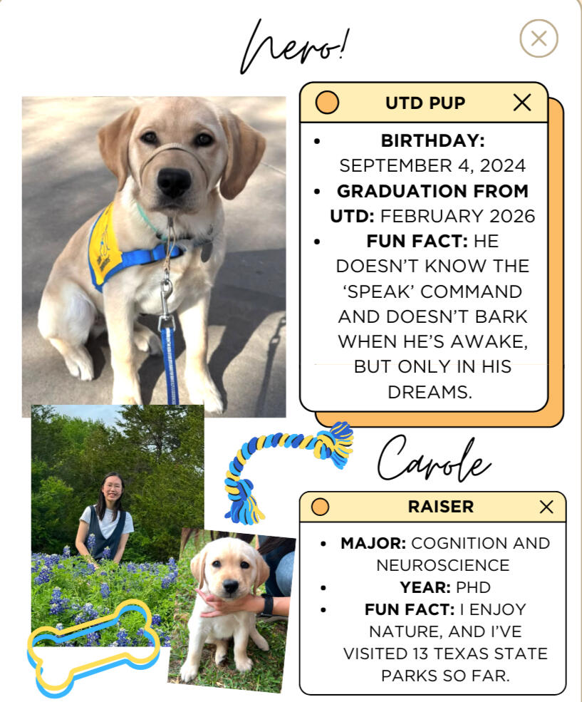UTD SIT is a collegiate group supported by Canine Companions. We give students the opportunity to raise and train puppies with Canine Companions, and these puppies go on to do great things. These puppies may go on to be service dogs for those with physical or mental disabilities, hearing aids, facility dogs, or as various other supporters.We began as an organization at the University of Texas at Dallas in 2016 and have grown and expanded our reach. Our proximity to the Canine Companions Irving Campus allows us many opportunities to serve in our community.